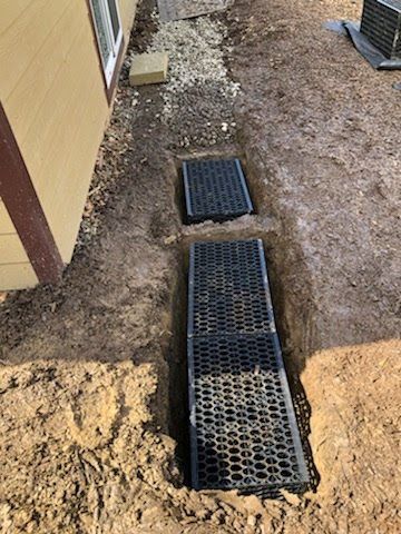 Similar to dry wells, an R-tank is a buried structure (think milk crate) that helps collect and allows water to percolate into the soil. It is more horizontal and honeycomb in design. They can collect water to either seep into the surrounding ground or the water can be conveyed to another location for dispersal.